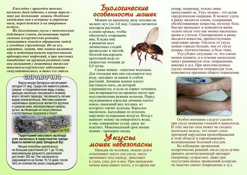 – в период наибольшей активности мошек - исключить, по возможности, пребывание людей и животных вблизи мест выплода (возле рек с быстротекущей водой) и массового их скопления;